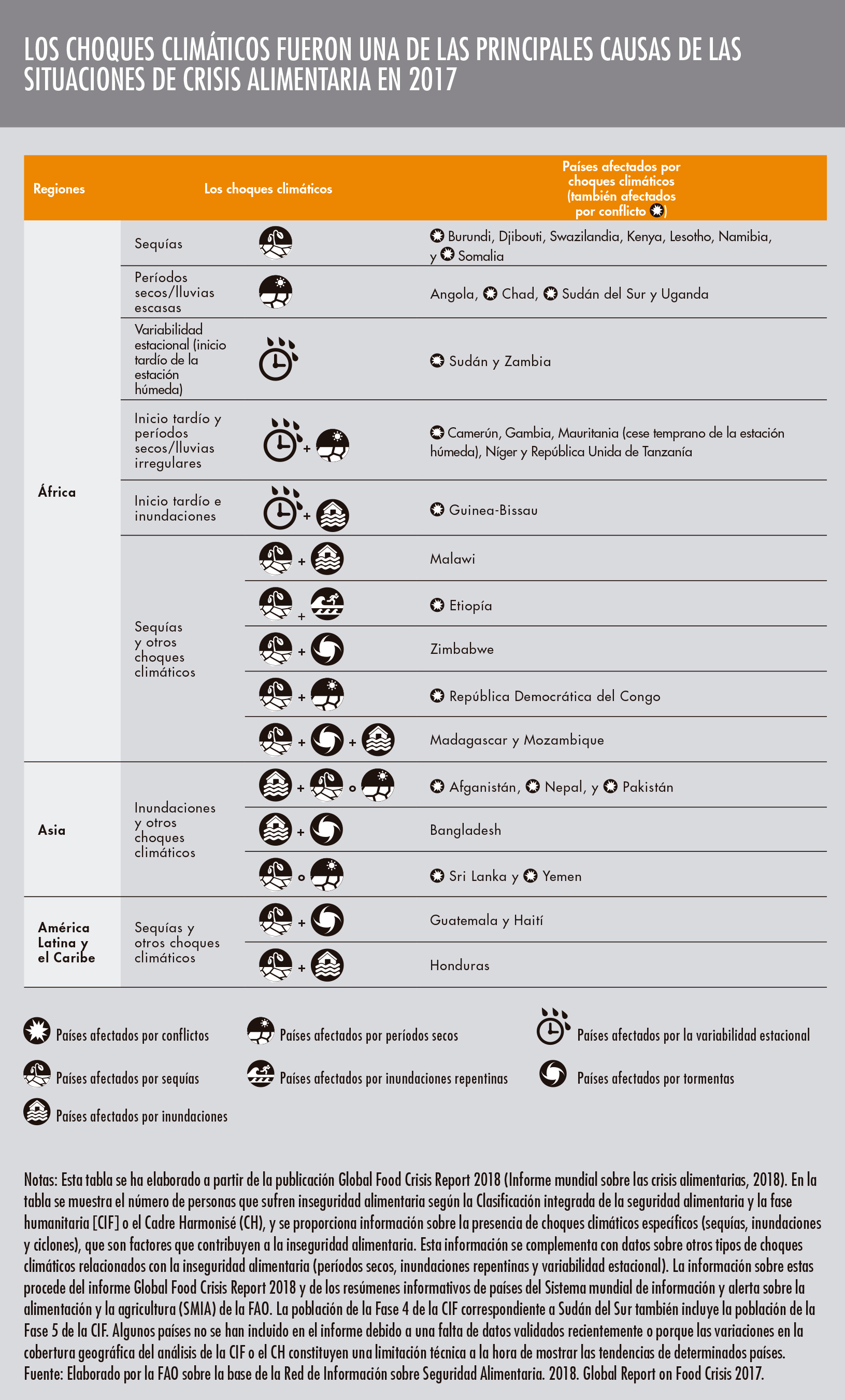 La variabilidad climática y los eventos extremos son una de las principales causas de las crisis alimentarias. En 2017, por ejemplo, los choques climáticos fueron la causa fundamental de crisis alimentarias en 34 de los 51 países que afrontaban inseguridad alimentaria. Donde los conflictos y los choques climáticos tienen lugar de manera conjunta, la repercusión en la inseguridad alimentaria aguda es aún mayor.