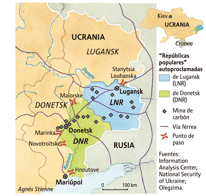 “Dispararon hacia el edificio la noche del 3 al 4 de febrero, hemos vuelto a abrir la tienda el 20, esta semana”. Envuelta en su hermosa bufanda y su abrigo, la vendedora nos muestra los destrozos causados por el Ejército ucraniano. Su tienda ha sido privada de ventanas a causa de la onda expansiva de las explosiones. Como toda la periferia de la ciudad de Donetsk, el barrio Kievski ostenta los estigmas del conflicto que enfrenta al Gobierno de Kiev con las milicias separatistas del Donbás, oficiosamente apoyadas por Moscú. Edificios destripados y fachadas llenas de cicatrices a causa de los estallidos de obús dan cuenta de una guerra que ha costado la vida a unas diez mil personas desde abril de 2014. (...)
