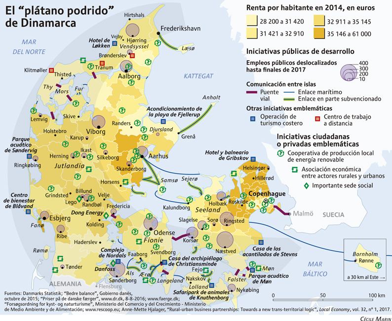 “Vejby era una comunidad dinámica del norte de Jutlandia. La localidad contaba con tres tiendas de ultramarinos, un grupo de artesanos y varias granjas. La fiesta estival reunía cada año a 150 visitantes durante tres días. Reducida a media jornada, ésta ya apenas atrae a unas treinta personas. El Gobierno ha suprimido las paradas de autobús regionales y los alumnos van actualmente a una escuela situada a varios kilómetros”. Thessa Jensen, profesora asociada en la Universidad de Aalborg, y su hermana Ilka Müller, ingeniera, han visto cómo su pueblo se ha ido despoblando durante los últimos quince años, a imagen y semejanza de muchos otros. Desde principios de los años 1990 ha aumentado la diferencia entre regiones urbanas cada vez más pobladas, Copenhague y Aarhus a la cabeza, y periferias en vías de relegación. En 2014, la región metropolitana de la capital producía el 41% de la riqueza nacional, mientras que en la Dinamarca de las periferias, al oeste y al sur, hay una caída y envejecimiento rápido de la población. En esos territorios que forman una especie de cruasán –llamados comúnmente “el plátano podrido” (rådne banan)–, los jóvenes se van, las fábricas y las tiendas cierran, las explotaciones agrícolas no se recuperan y los servicios públicos se marchitan.