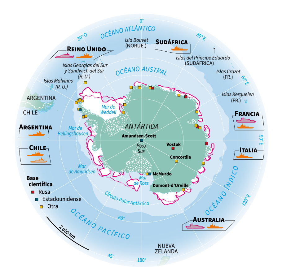 En la Antártida, el tratado de 1961 congeló los reclamos territoriales autorizando solo actividades pacíficas con fines científicos. Una treintena de naciones mantienen bases científicas para entender la evolución del clima y las principales corrientes oceánicas globales que nacen en esas aguas. Sin duda, muchos también toman posiciones ante la posibilidad de tener acceso algún día a los recursos naturales.