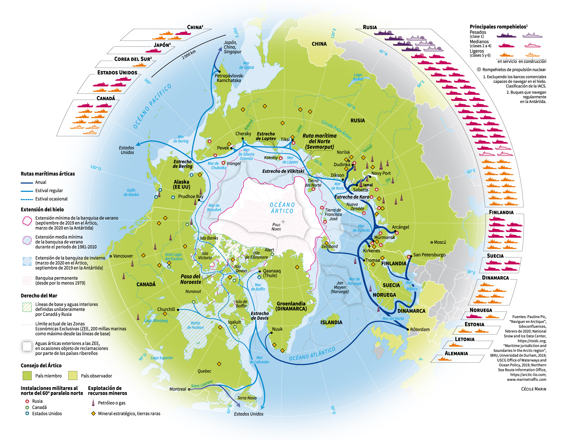 Transportando turistas por el Polo Norte bajo el sol de medianoche en verano, o cubiertos por la escarcha en la noche polar bajo temperaturas que pueden rozar los 50 grados bajo cero, estos barcos de asistencia nunca habían surcado tanto los océanos. La única flota atómica rusa abrió la ruta a 510 barcos en 2019, frente a los 400 de media de los dos años precedentes. Aunque todos los barcos que surcan los mares fríos han de tener un casco reforzado, la Asociación Internacional de Sociedades de Clasificación designa como “rompehielos” aquellos cuya masa, perfil y potencia les permiten franquear una banquisa de al menos setenta centímetros de espesor. Las naves más pesadas pueden vencer a pequeña velocidad hielos de varios años, que pueden ser de más de 4 metros, y crestas de compresión entre dos placas de hielo de más de diez metros. Al posibilitar la navegación y el comercio marítimo en las regiones frías, esos buques cumplen en primer lugar una función utilitaria en la desembocadura del San Lorenzo, de los mares Báltico, Blanco y de Ojotsk… Pero también son barcos de soberanía marítima en regiones polares que están despertando nuevos apetitos.