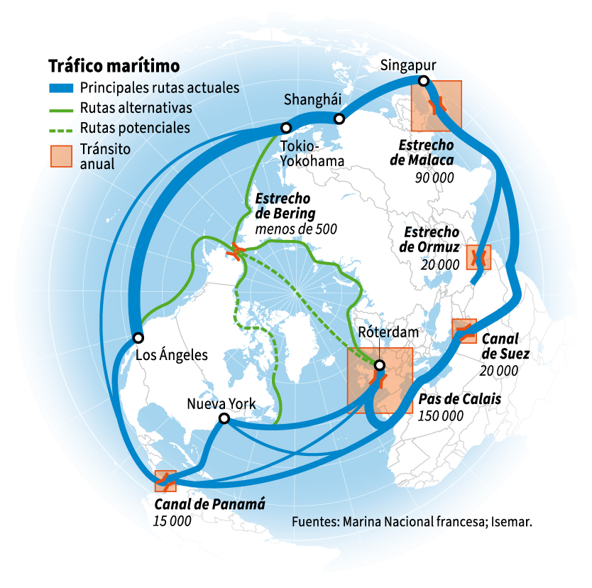 En conjunto, el hielo marino probablemente se volverá menos grueso y extenso en los próximos años. Esto no significa que en los océanos polares los barcos vayan a navegar por aguas libres. Se formarán banquisas todavía buena parte del año. De ahí la paradoja: cuanto más se funde el hielo marino, mayor es la demanda de rompehielos, como se puede apreciar desde mediados de la década del 2000. Estos buques seguirán siendo indispensables para el desarrollo de las rutas polares, que presentan la ventaja de recortar la distancia entre numerosos puertos del Pacífico y el Atlántico. Por ejemplo, el viaje de Róterdam a Yokohama por el Canal de Suez es de 20.700 kilómetros y de solo 12.700 kilómetros por la ruta del Norte (6). Entre Nueva York y Shanghái, la distancia marítima es de 19.600 kilómetros por Panamá y de 14.500 por el norte de Canadá.