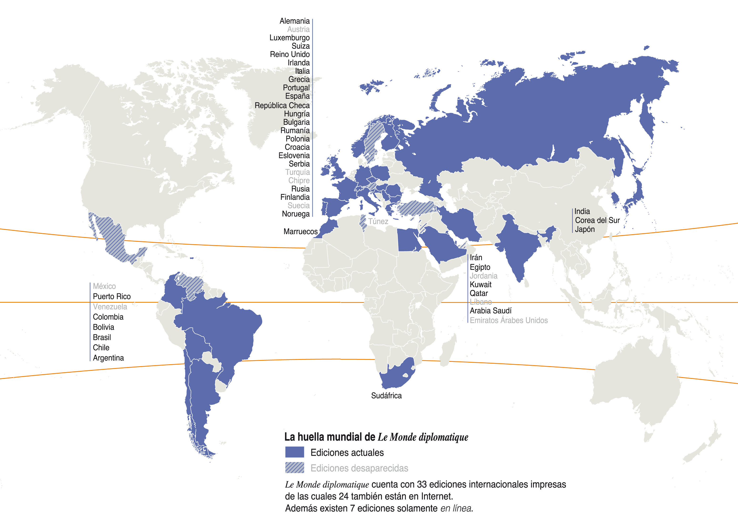 El diario The International Herald Tribune se imprime en nueve países. El semanario Newsweek ostenta cuatro ediciones internacionales. El mensual Elle cuenta con quince versiones extranjeras. Le Monde diplomatique, por su parte, se multiplica en más de sesenta ediciones internacionales: la mitad de ellas se imprime y las otras se encuentran online. Ahí termina la comparación. Los socios del Herald y de Elle implementan una estrategia comercial; los del Dipló comparten sobre todo el sueño de un mundo distinto. En veinticinco lenguas, además del francés: afrikáans, alemán, inglés, árabe, búlgaro, catalán, chino, coreano, croata, español, esperanto, farsi, finés, griego, húngaro, italiano, japonés, noruego, polaco, portugués, rumano, ruso, serbio, esloveno y checo…