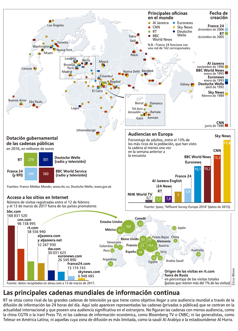 Con 2.100 empleados y oficinas en diecinueve países, el grupo se ha desarrollado gracias a los importantes recursos que el Estado ruso ha puesto a su disposición. Según una encuesta del instituto Ipsos realizada en marzo de 2016 en 38 países, 70 millones de personas ven sus cadenas cada semana: una audiencia que se sitúa por detrás de la del servicio internacional de British Broadcasting Corporation (BBC), pero por delante de la de Deutsche Welle y de France 24. Con respectivamente 8 y 36 millones de telespectadores semanales, RT es además la quinta cadena internacional más vista en Estados Unidos y en Europa, sus objetivos prioritarios. Desde su creación, su presupuesto se ha decuplicado, pasando de 29 a 290 millones de euros –cerca de una cuarta parte de las asignaciones públicas otorgadas a los medios de comunicación–. La cadena se adaptó rápidamente a la promoción de contenidos en Internet utilizando de forma masiva las tecnologías digitales virales (retransmisión de vídeos en directo, realidad aumentada, etc.). El grupo abrió múltiples cuentas en las redes sociales, así como en YouTube, donde se presenta como la primera fuente de información del mundo con 4,5 millones de abonados, todas las cadenas incluidas. El modelo de Cable News Network (CNN) –inmediatez, “última hora”, info-entretenimiento– sigue siendo una referencia en materia de producción.