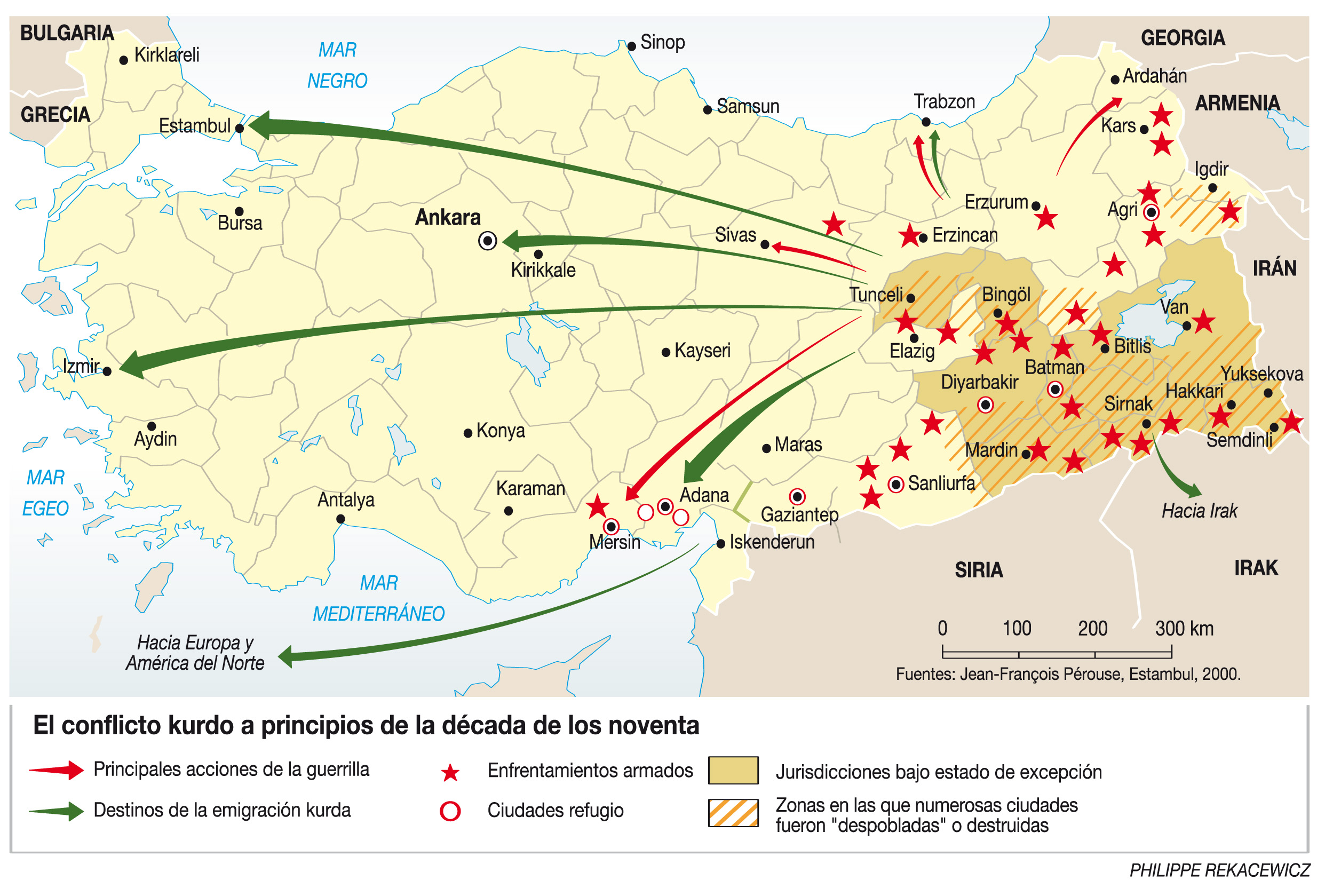 Awat H. tiene cerca de cincuenta años, expresión de fatiga, el cabello encanecido por casi treinta años de aislamiento en las cárceles turcas, y atiende un pequeño comercio en Dyarbakir. En las paredes de su modesto local no se ve ningún retrato de Atatürk, y ninguna bandera turca. Liberado en 2006, Awat volvió a vivir en la capital histórica del Kurdistán, por el cual comenzó a luchar en la universidad, a finales de la década de 1970. Al saber que hemos visitado campamentos clandestinos del Partido de los Trabajadores del Kurdistán (PKK) en las montañas del norte de Irak, su desconfianza se esfuma. Pero, como todos los que aceptan hablar, exige el anonimato. “Aquí, nosotros vivimos como los palestinos de Gaza y de Cisjordania, en permanente contacto con un ejército y una policía de ocupación, que vigilan cada uno de nuestros actos. Vayan hasta la frontera iraquí, vean nuestras ciudades (...)