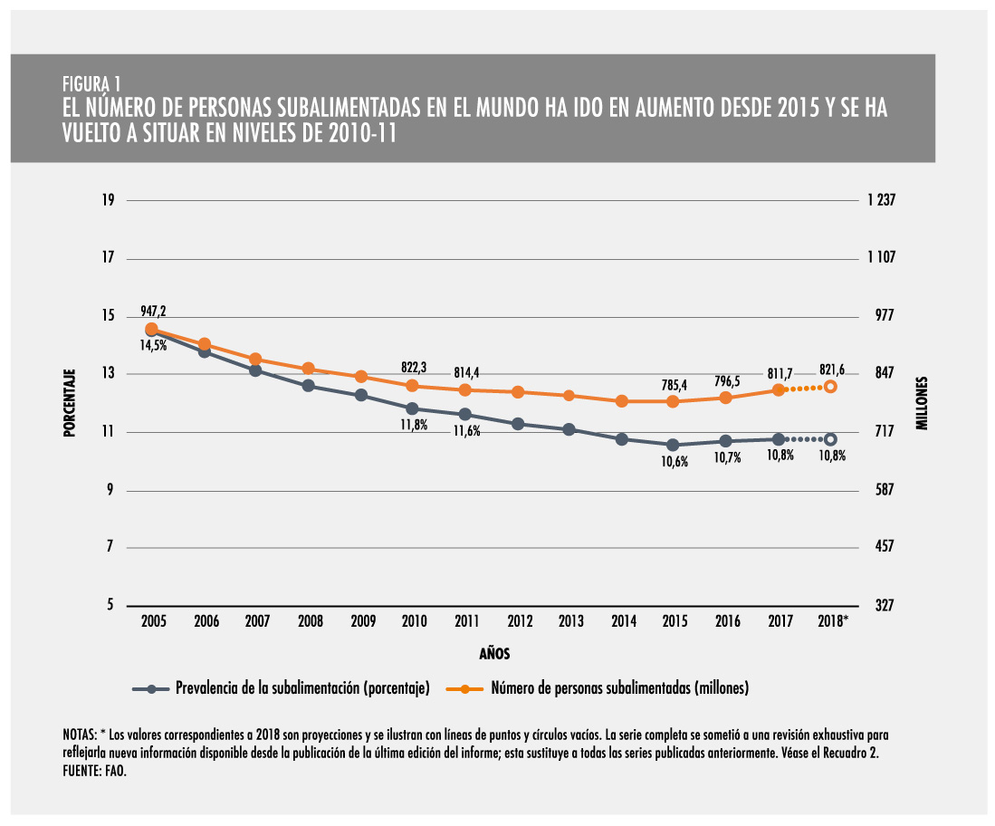 El hambre en el mundo está aumentando y alcanza ya la cifra de los 820 millones de personas. La región donde más está creciendo proporcionalmente es África aunque Asia sigue siendo la región con más hambrientos del mundo.Globalmente esta cifra supone aproximadamente el 11% del total de la población mundial, es decir, una de cada nueve personas (véase figura 1 y cuadro 2). Estas cifras ponen de relieve el inmenso desafío que supone lograr el objetivo del hambre cero para 2030.